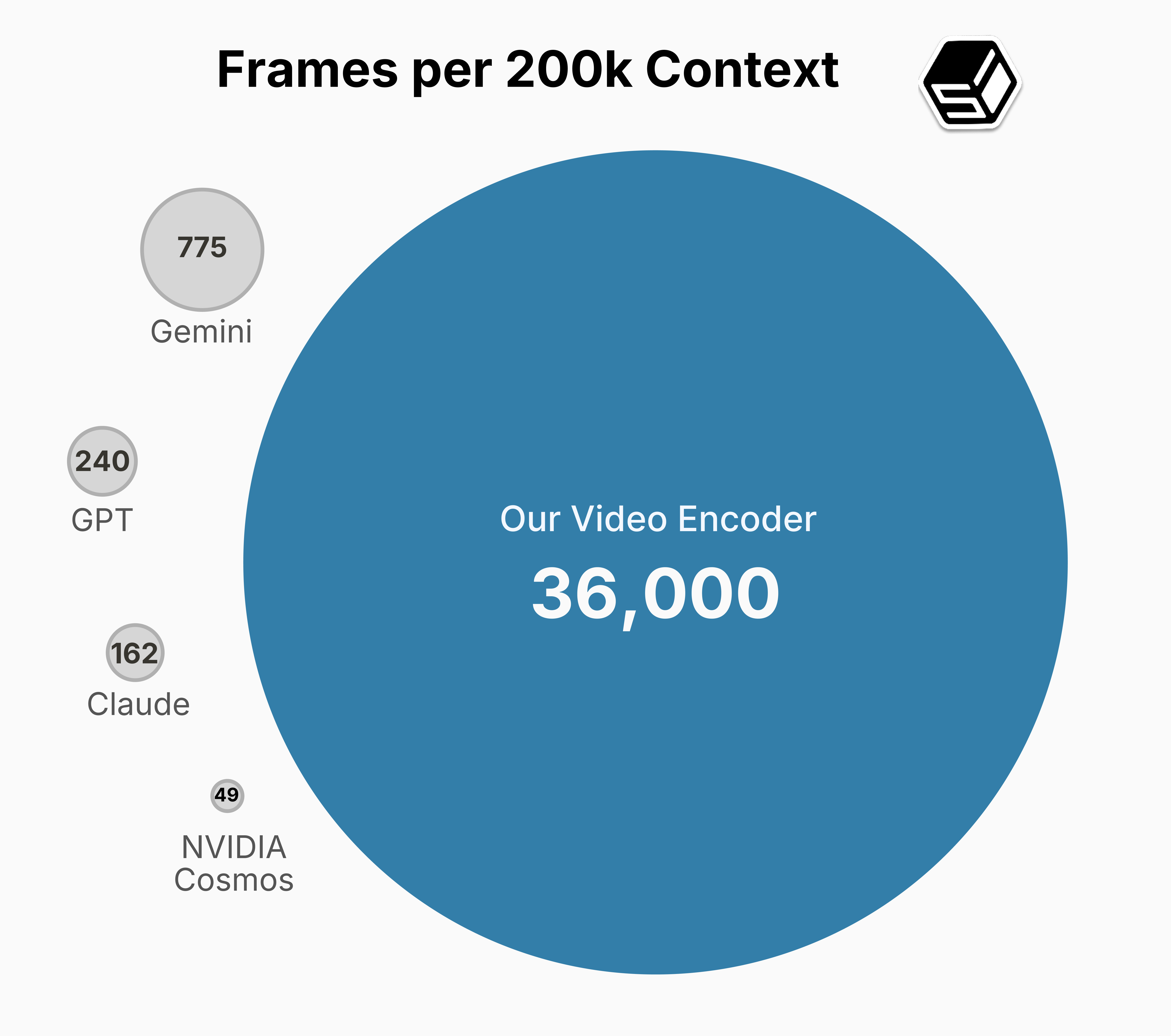 The missing piece is a video encoder. VLMs burn a million tokens to understand just one minute of 30 FPS computer data. Our video encoder encodes nearly 2 hours of video in the same number of tokens—that’s 50x more token-efficient than the previous state-of-the-art and 100x more token-efficient than OpenAI’s encoder. These improvements in context length and dataset size mean we can finally pretrain on enough video to scale computer action models.