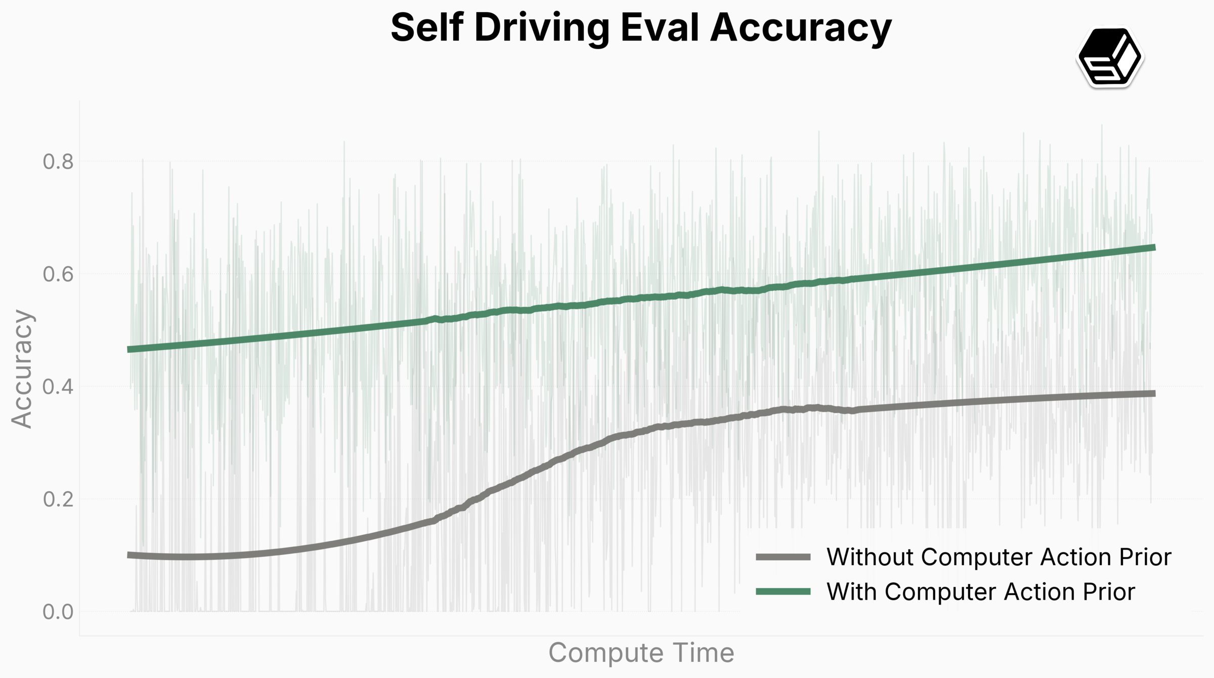 Our model successfully and scalably infers human behavior on complex tasks like object segmentation and 3D manipulation. We also demonstrate that training on computer use generalizes to the real world significantly more easily than a model without such training. In our self-driving tests, the model is able to use a web interface to navigate turns around a block in San Francisco after finetuning on less than 1 hour of collected data. FDM-1 starts with 50% accuracy on key press prediction (a choice between no action, move left, or move right Figure ?), significantly higher than the baseline model with only our video encoder (and no internet video pretraining). Our model also achieves steeper scaling trends compared to the baseline. We expect to achieve zero shot performance on such tasks in the future.